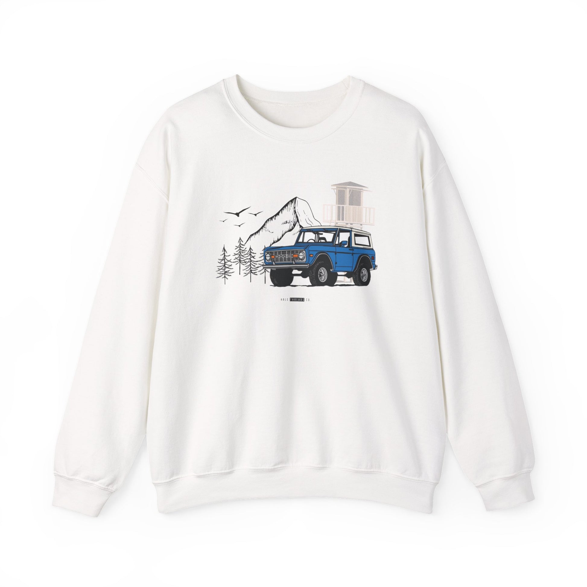 The design features an old-school Bronco rolling through the mountains, a nod to the timeless thrill of dirt roads, hard work, and wide-open skies. Tough, classic, and made to last — this crewneck belongs to the ones who never stop exploring.