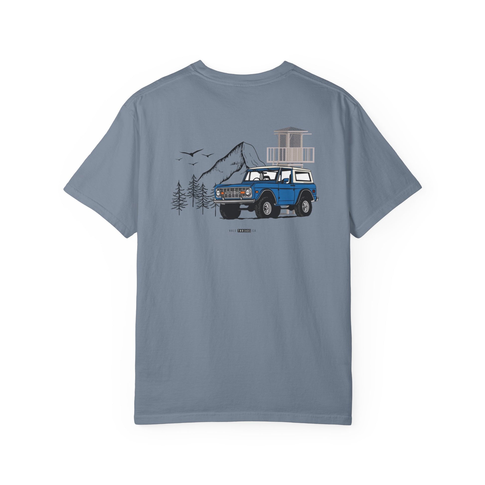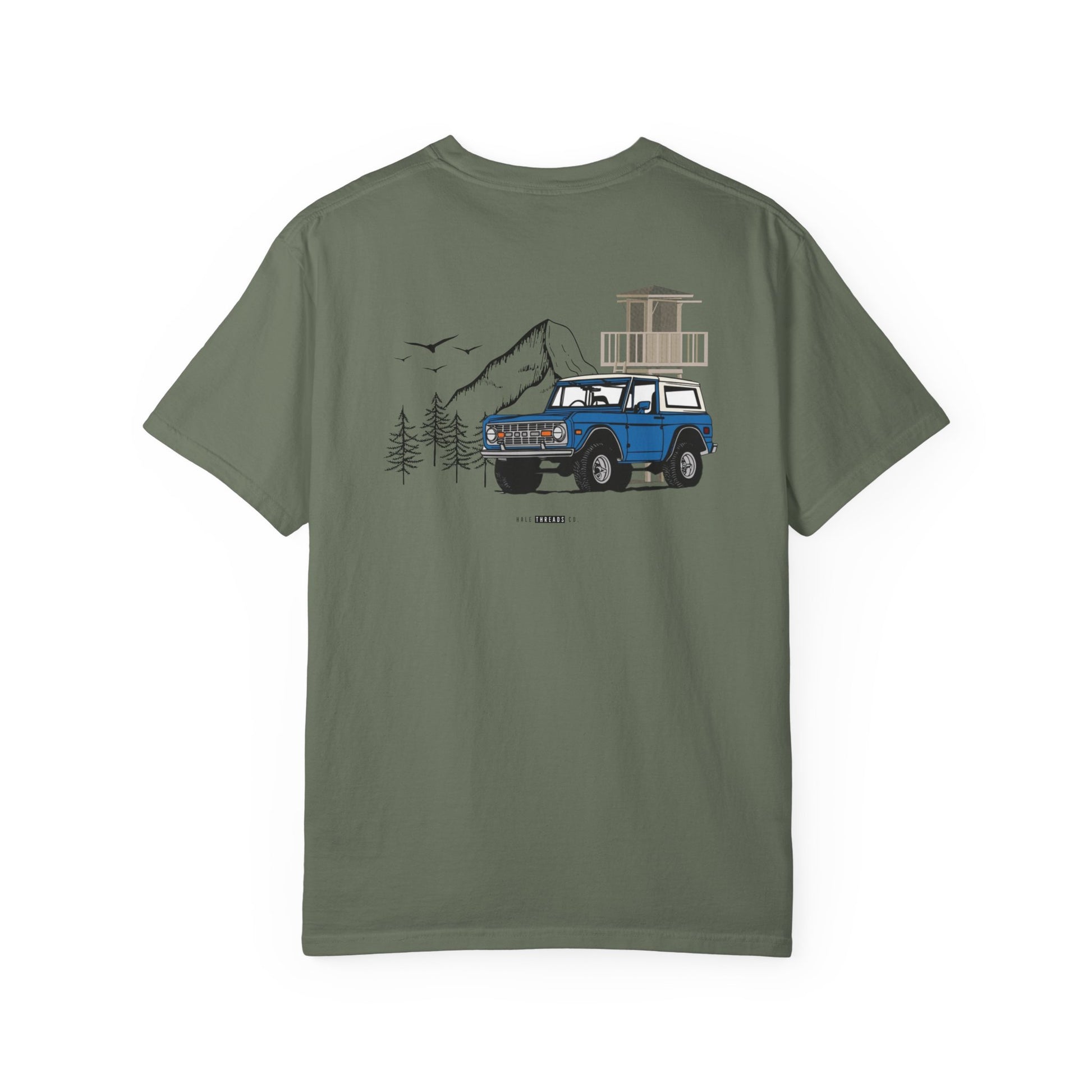 The design features an old-school Bronco climbing through the mountains, capturing that timeless mix of grit, dust, and open-country pride. Whether you’re cruising backroads, camping out, or just living wild and free, this shirt was made for the ones who never take the easy route.